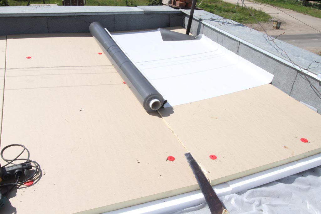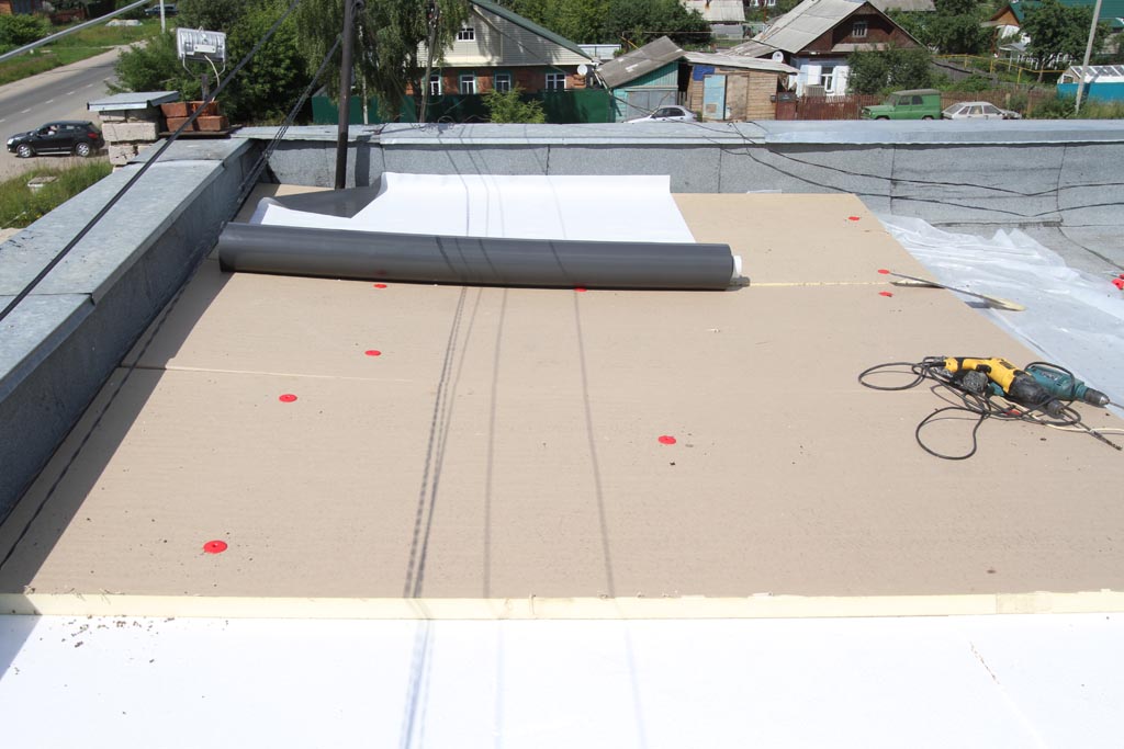Решая проблему выравнивания поверхности крыши, рабочие применили многослойный «пирог» из пароизоляционной плёнки, пенопласта, PIR плиты и полимерной трехслойной мембраны.